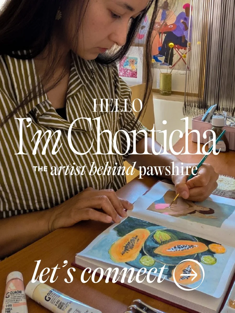 Welcome to Pawshire. I'm Chonticha, a painter who works mostly in gouache, and whenever I travel, I visit art stores like they’re temples. I don’t go in looking for fancy tools… I go in to feel inspired. The colors, the packaging, the quietness of each aisle… it’s all part of how I find ideas for my next piece.